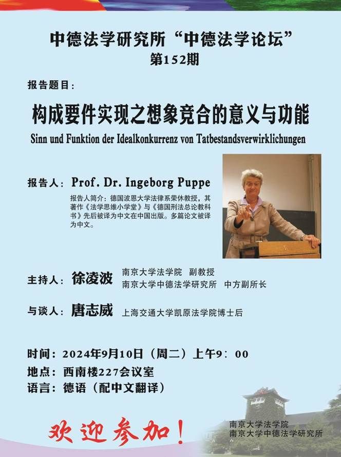 中德法学研究所邀请,德国波恩大学法律系荣休教授Ingeborg Puppe教授为第152期“中德法学论坛”做了题为“构成要件实现之想象竞合的意义与功能”的学术讲座。