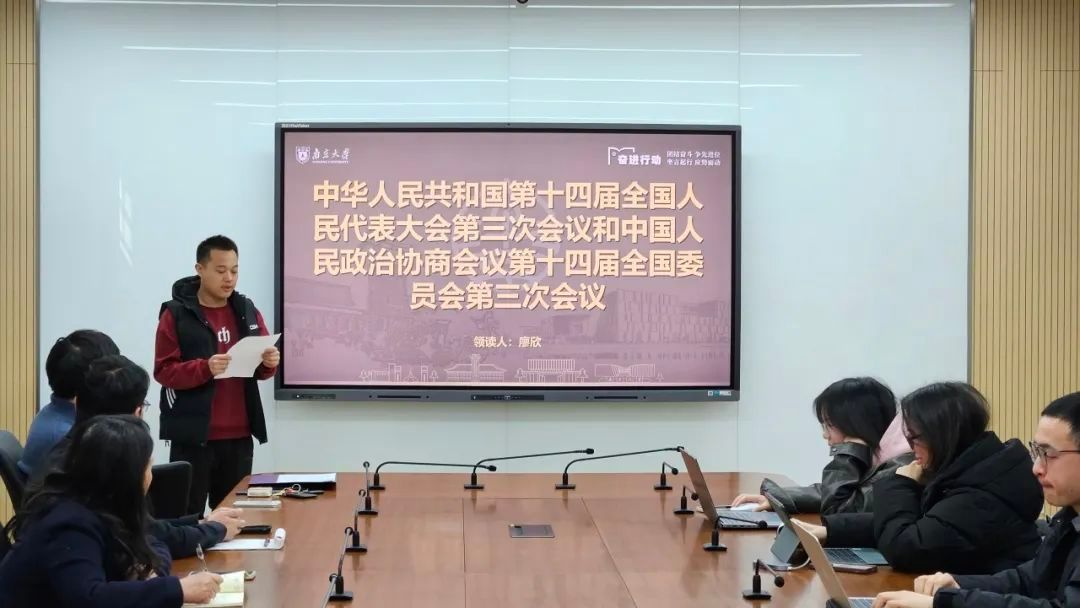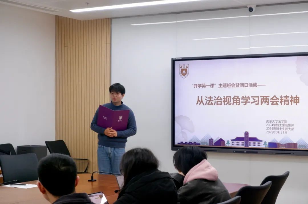 为深入学习贯彻2025年全国两会精神,引导青年学子关注国家发展、担当时代使命,南京大学法学院2024级博士生团支部于3月31日下午成功举办了主题班会暨团日活动——从法治视角学习两会精神。本次活动紧紧围绕政府工作报告及全国人大常委会工作报告展开。南京大学法学院党委副书记马骏老师、博士生辅导员赵风老师应邀参加并作指导。