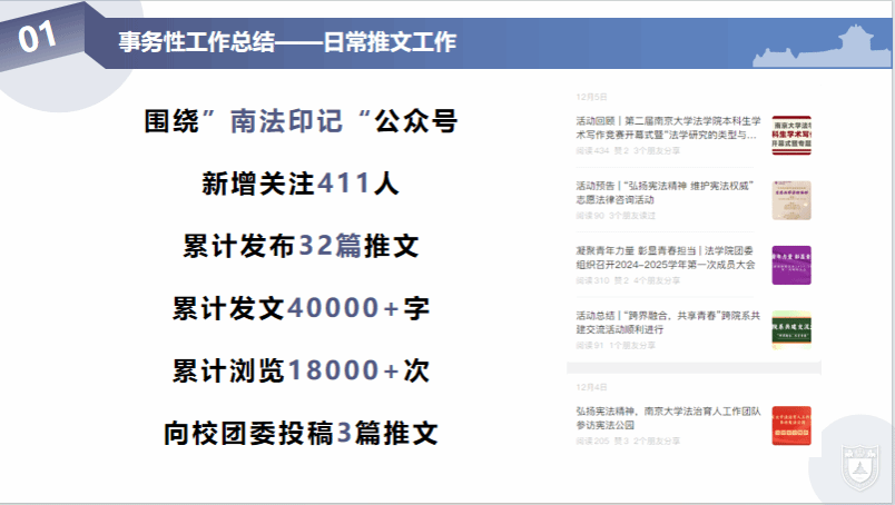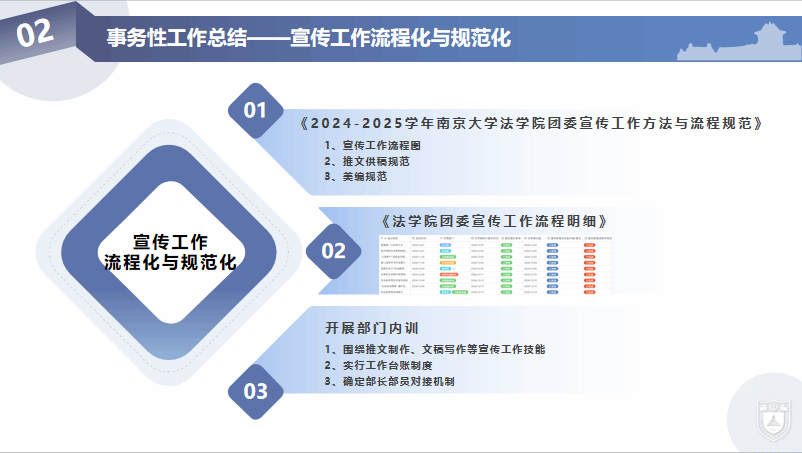 在工作坊的引领与推动下,宣传部在宣传工作方面通过一系列创新举措,显著提升了宣传工作的质量和效率。在保质保量做好日常推文工作的同时,宣传部制作《法学院团委宣传工作方法与流程规范》,在宣传工作流程、推文供稿规范以及美编规范等方面作出具体细致要求。为进一步提高宣传工作效率,宣传部制作《法学院团委宣传工作流程明细》,加强了与各部门的紧密联系,提升团委宣传工作的质量与效率。