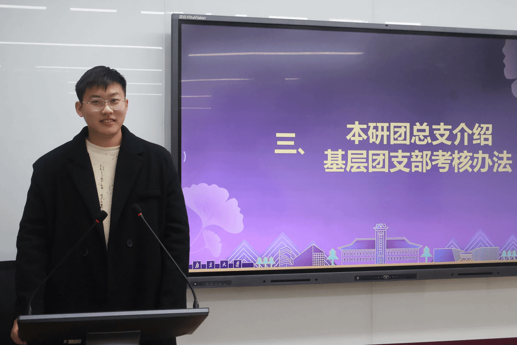 接着,本科生团总支学生代表丁曜同学围绕基层团支部管理与考核工作发言。丁曜全面介绍了本学期团总支在学社衔接、入党积极分子推优等方面的工作成效,并对新颁布的《南京大学法学院团支部考核办法(试行)》进行详细解读。《考核办法》从团支部书记思想政治素质、团支部建设、团员管理工作、支部创新考核专项等四个方面开展全面考核,规范南京大学法学院团支部的建设与管理,促进团支部委员会履职尽责,提升团支部的组织力和凝聚力。
