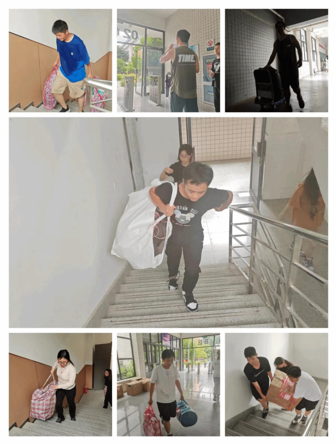由热心同学组成的志愿者队伍在搬迁过程中发挥了重要作用。他们帮助23级新生们搬运沉重的行李,他们汗流浃背而又挺拔有力的身影成为炎炎七月靓丽的风景线。志愿者们坚守岗位,以饱满的热情投身工作,诠释了“服务他人、奉献社会”的崇高精神,以负责态度和热忱奉献收获了大家的一致好评与真诚感谢。同时,辅导员平凡老师坚守在现场,有条不紊地协调各方资源,身体力行地帮助学生搬运行李。