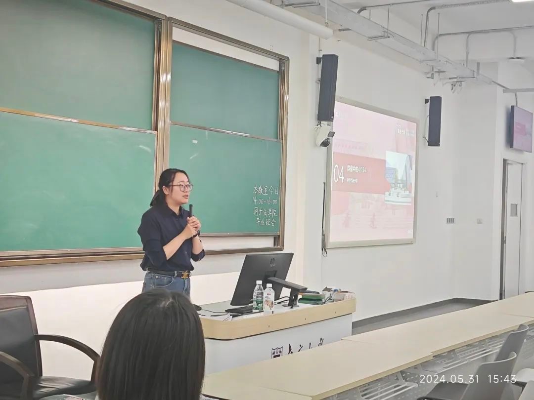 2020级本科生辅导员路敏玥老师向同学们送上了毕业寄语。路老师首先就毕业要求、毕业手续等事项向同学们进行了说明。而后,路老师回忆了三年来与同学们一路相伴的美好经历。最后,路老师祝福同学们毕业快乐、前途璀璨,也向大家提出了未来的期望。