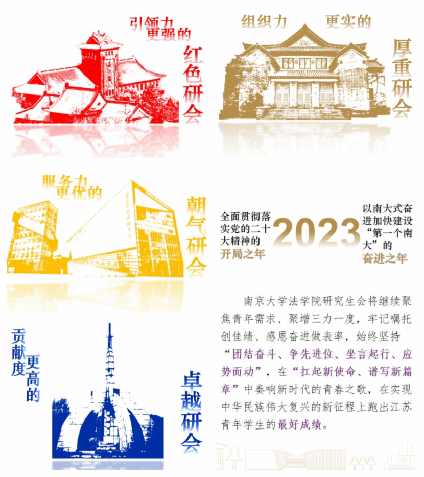 2023年是贯彻落实党的二十大精神的开局之年,也是落实南京大学奋进行动的关键之年。团结奋进聚合力,挺膺担当启新程,在院党委的领导下,在院团委和校研会的共同指导下,南京大学法学院研究生会始终坚持“全心全意为同学服务”的根本宗旨,践行“心系同学事,肩扛研会责”的职责使命,赓续传承求实、担当、奋进、创新的精神品质,勇毅笃行,躬耕不辍,奋进南雍,行动天下,交出了一份竭诚服务同学、谱写研会新篇的优异答卷。