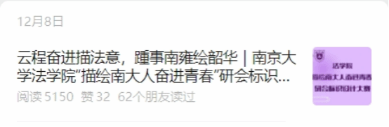 高度重视融媒体、全平台宣传工作,以“NJU法学研会”作为对外主窗口,关注人数近7000人。围绕思想强基、时事聚焦发布推文逾百篇,主题包括党政活动、学生活动和求职招聘等校园生活的全领域、全方面,总阅读量超过33万次,被分享转发次数过万。其中“云程奋进描法意,踵事南雍绘韶华”南京大学法学院“描绘南大人奋进青春”研会标识设计大赛投票评选阅读量超过5000次,再创研会新高。
