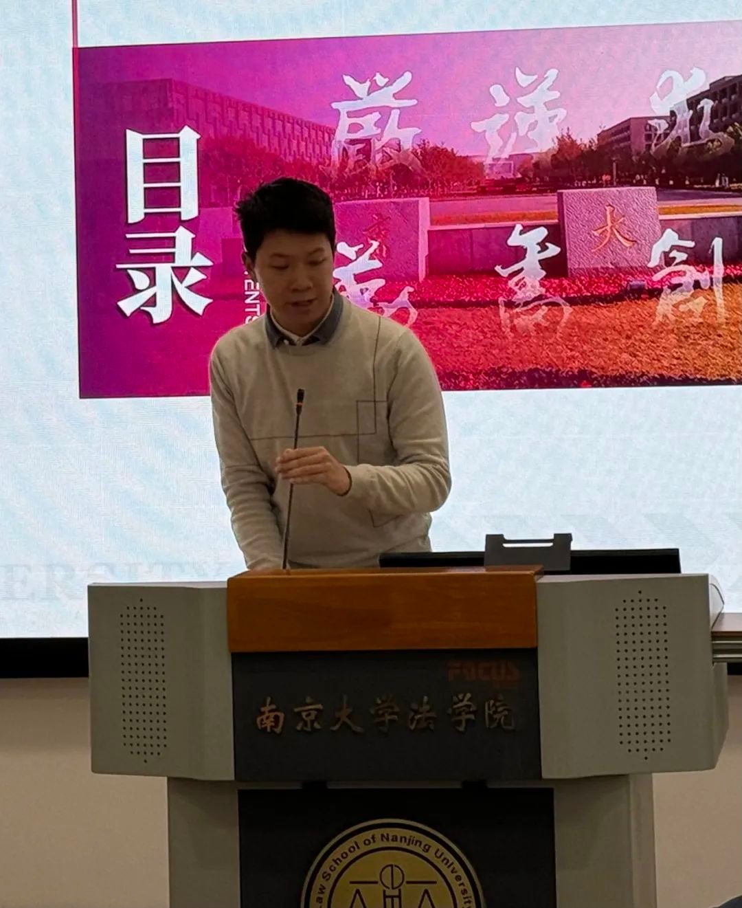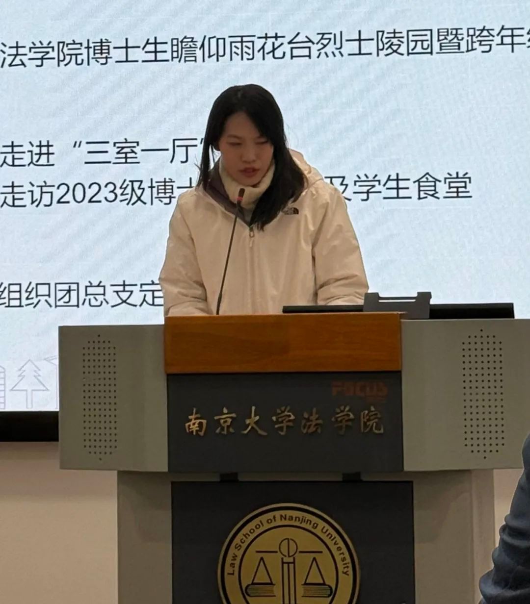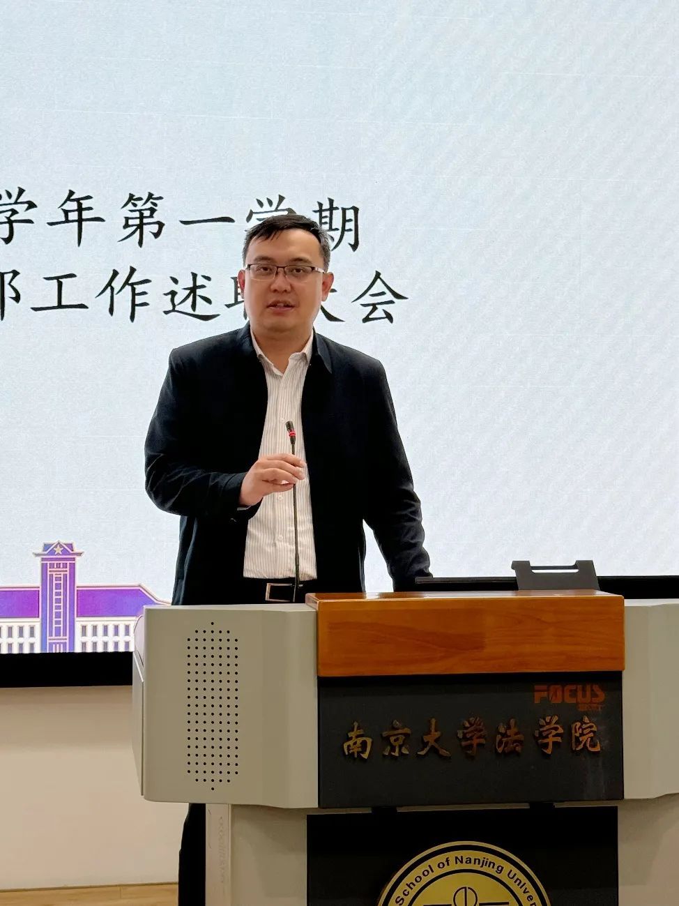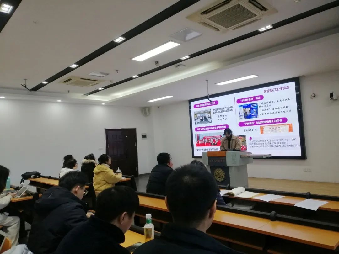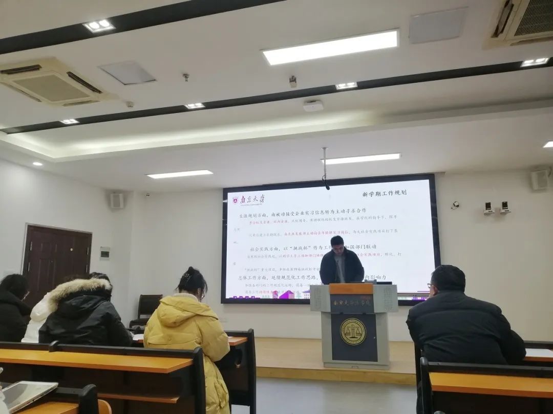12月22日下午,法学院2023-2024学年第一学期团学组织主要学生干部述职大会于仙林校区举行。法学院党委副书记马骏老师出席并作点评讲话。法学院全体辅导员老师、班主任和德育导师代表出席活动。会议由院团委书记路敏玥老师主持。