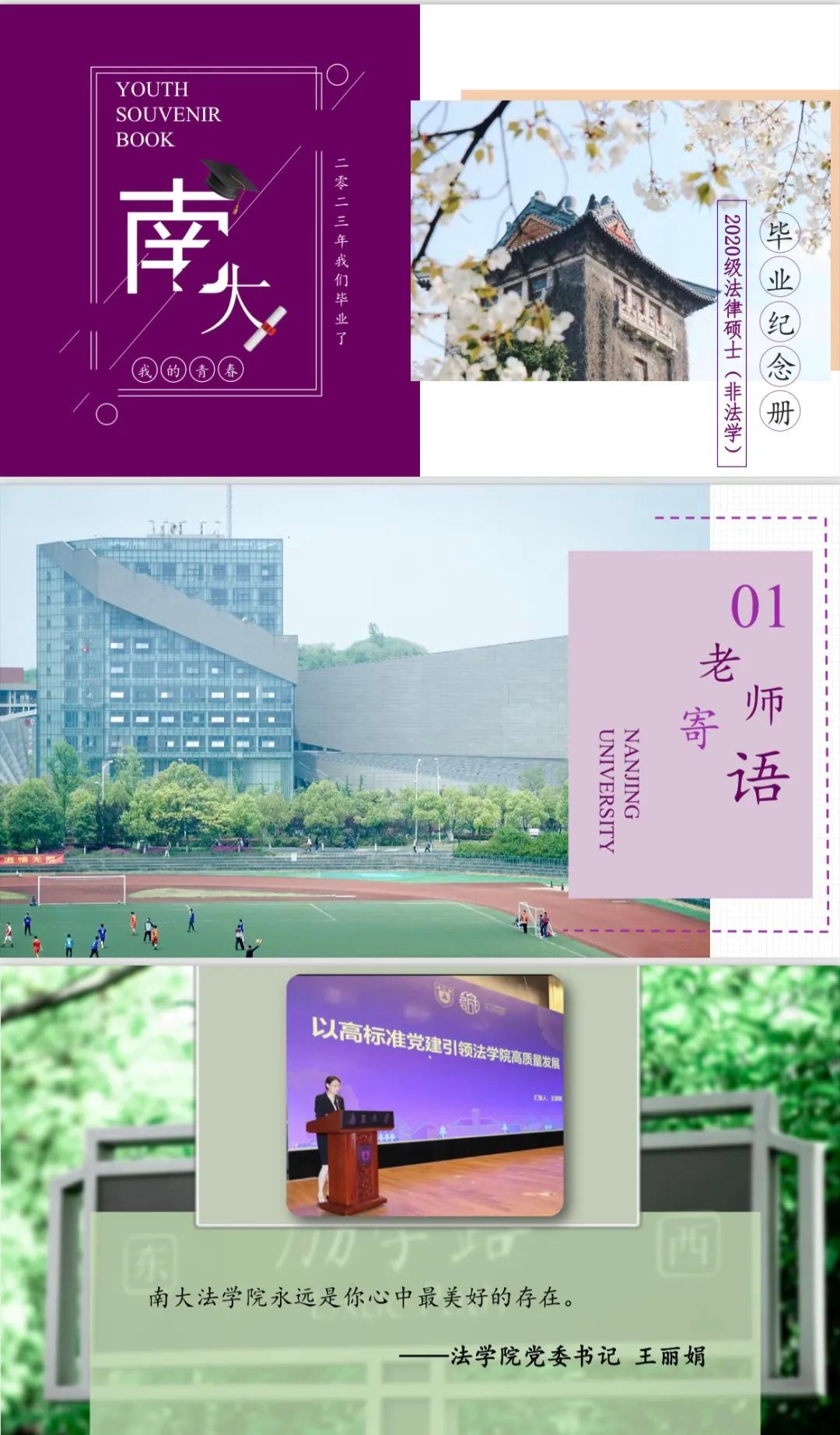 六月逐梦帆起,奋进之志可期。临别之际,法学院向各位教师征集毕业寄语,收集各位同学的照片与留言,为2023届研究生制作了精美的毕业纪念册,把一份份感动与时光的掠影浓缩于纪念册的方寸之间,以真心将其收藏。
