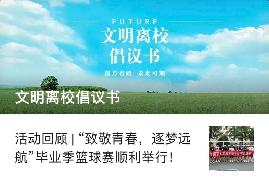 以奋进之声,传爱校深情。南京大学法学院向全体2023届研究生发出文明离校倡议书,呼吁全体毕业生继续保持南大人昂扬向上的精神风貌,争当文明使者,展示积极向上形象。法学院深入开展毕业生人身安全、财产安全、健康安全、求职安全、心理安全等多维度教育,倡议同学们在离校前继续爱护校园设施,在离校中强化“安全第一”防范意识,在离校后心系祖国、情系南大,以报效国家、服务人民为自觉追求,在各自的岗位上不懈努力,为全面建设社会主义现代化国家、实现中华民族伟大复兴的中国梦积极贡献自身智慧和力量。