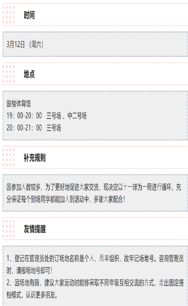 为同学们于每周六晚上7点预约羽毛球馆场地,并通过“NJU法学研会”公众号公布具体的时间、地点和注意事项,节约自行预约的时间成本。