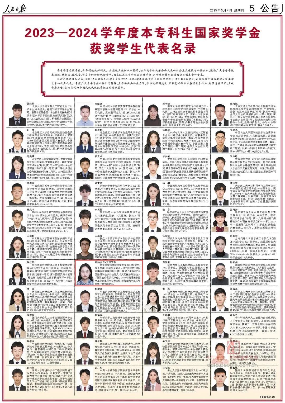 5月4日,《人民日报》(第05、06版)刊登《2023—2024学年度本专科生国家奖学金获奖学生代表名录》,我院买热合巴·艾尼瓦尔同学入选名录。