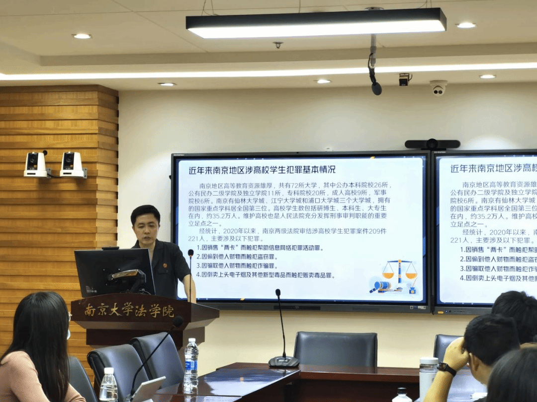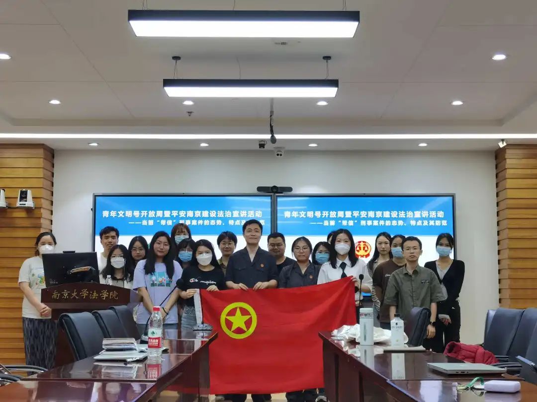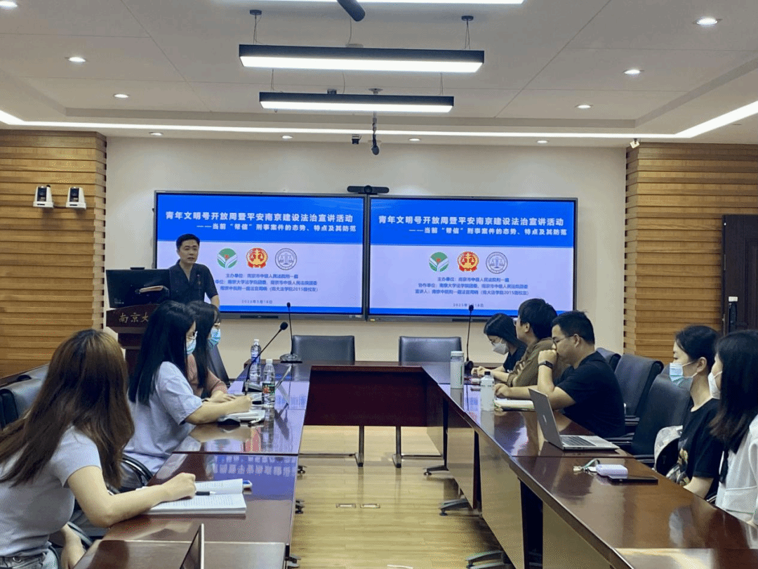2023年5月18日晚,“能动司法助力平安南京建设——刑事法官推进平安法治宣传进校园”活动在鼓楼校区逸夫管理科学楼1205会议室成功举办。本次活动由南京市中级人民法院刑一庭、南京市中级人民法院团委、南京大学法学院团委主办,法学院研究生团总支、2021级法学硕士团支部共同承办。南京市中级人民法院刑一庭法官、南大校友周晓作为主讲人,针对案件办理过程中遇到的高校学生犯罪类型进行法治宣讲,重点分享了当前“帮信”刑事案件的形态、特点及其防范对策。市法院刑一庭法官助理刘婷婷、2021级法学硕士团支部学生参与了活动。