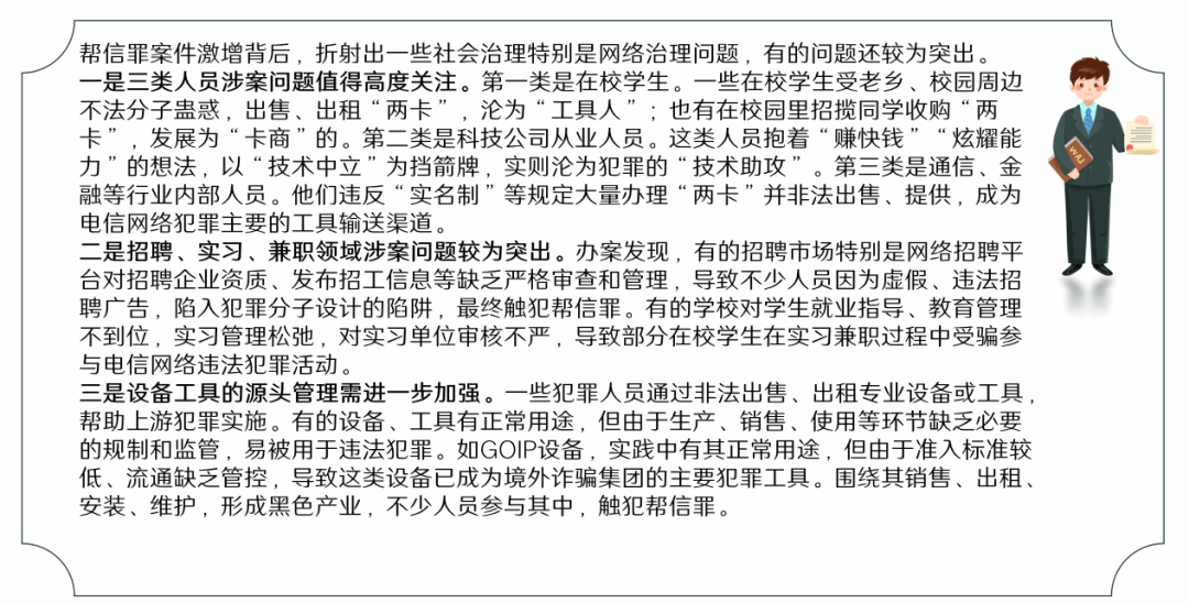 接着,周晓法官对当前帮信案件的特点进行了分析。从人员年龄看,帮信罪案件低龄化现象突出,低学历、低收入群体占多数;从行为方式看,帮信罪犯罪组织化模式常见,分工细化的特征突出;从办理案件看,帮信行为所帮助的上游电信网络犯罪主要集中在电信网络诈骗、网络赌博等领域。