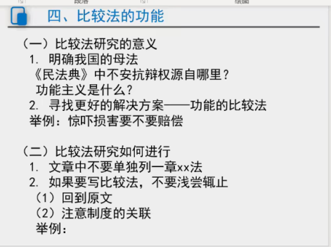 冯老师明确了比较法在论文写作中的价值与功能,即明确我国的制度继受来源与寻找更好的问题解决方案。在比较法研究如何进行的问题上,老师提醒大家关注制度间的联系,避免落入孤立列举比较法条文的误区,应当回到原文深入研究,并注意区分作为论理依据的比较法和作为资料的比较法在研究与分析中的区别。