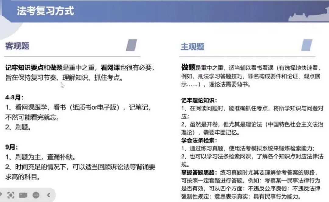 需根据学科性质与性价比、自身基础等来选择复习方法和侧重点。学姐本人客观题备考用时约2个月(7月中-9月中),主观题约1个月(9月中-10月中),可供同学参考。