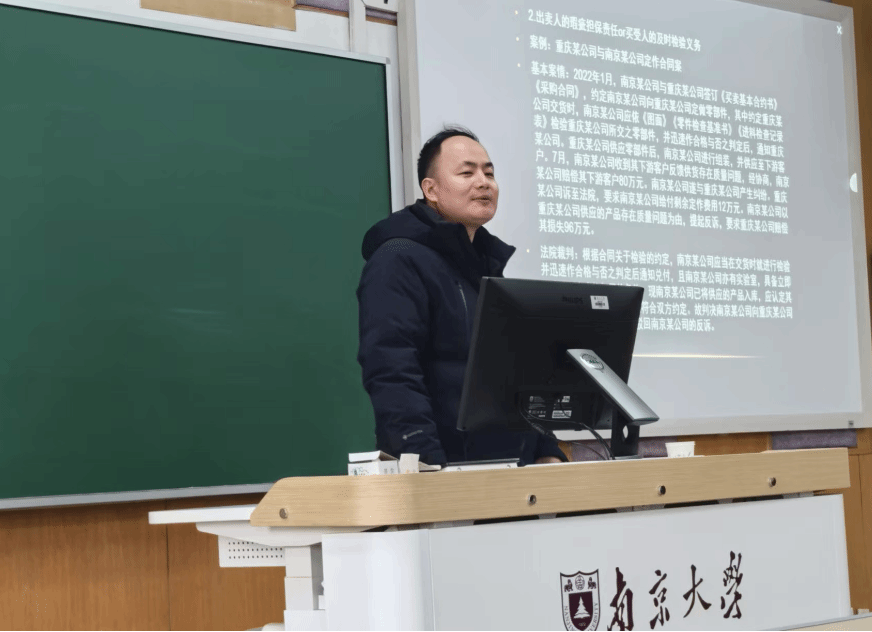 2025年3月7日(周五)下午2:00,南京大学法学院2024级法律(法学)硕士于浦口校区浦2-206教室开展了本学期第三次“诊所法律教育”课程。课程由南京大学法学院单锋教授主持,南京市中级人民法院民二庭副庭长程俊杰法官担任主讲嘉宾。程法官就《商事交易的法律风险防范》进行了专题分享,通过剖析商事合同与公司纠纷的典型案例,深入解析了商事实务中需注意的合同主体、标的、价款等问题,为同学们带来一场知识与智慧的盛宴。