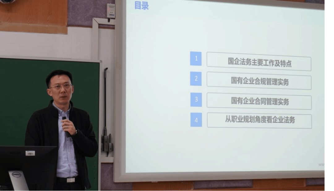 蒋建文总监首先介绍了其在南大的学习经历以及先后任职工作经历,并在课堂上调研了同学们对企业法务的求职意向。接着,蒋总监向同学们讲述了国企法务的主要工作与特点、国有企业合规管理实务、国有企业合同管理实务以及从职业规划角度看企业法务共四个部分的内容。