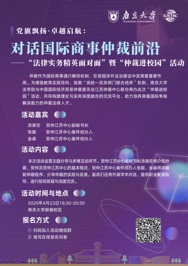为响应“统筹推进国内法治和涉外法治”战略部署,推动涉外仲裁人才培养,南京大学法学院与中国国际经济贸易仲裁委员会江苏仲裁中心(以下简称“贸仲江苏中心”)联合举办此次“法律实务精英面对面”暨“仲裁进校园”活动。本次活动将邀请具有丰富仲裁实务经验的贸仲江苏中心副秘书长和案件经办人,围绕贸仲及贸仲江苏中心情况、仲裁实践与发展等主题进行分享,为同学们搭建近距离接触商事仲裁法律人才的平台。该活动旨在“产教融合,协同育人”,探索高校与仲裁行业“联动培养”机制,帮助同学们在实践中了解商事仲裁法律实务与商事仲裁机构设置,助力同学们投入商事仲裁法律实践。