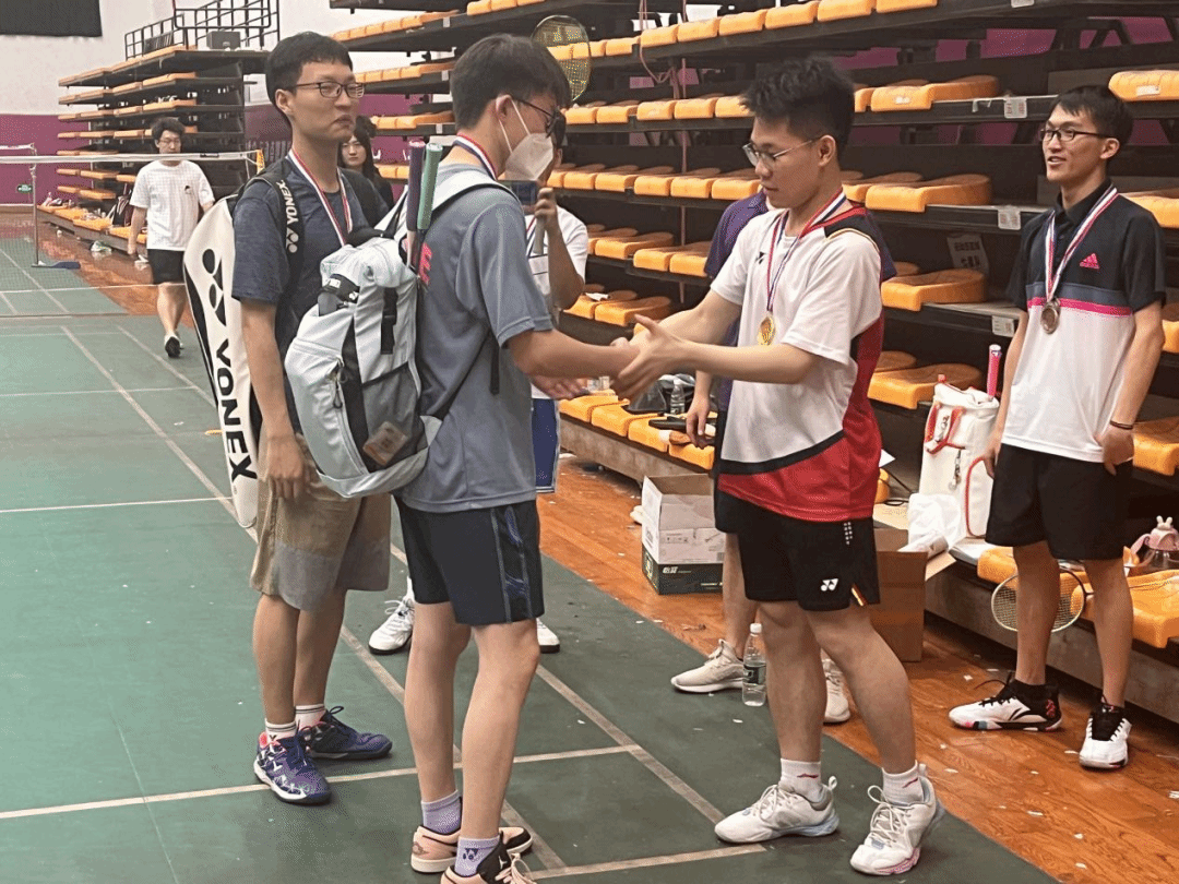 淘汰赛随机抽签,采取15分制,三局两胜,两两一组,胜者晋级决赛。经过激烈的淘汰赛阶段,最终角逐出三强,分别为钟梓良、李金卓与曾宇龙。在决赛开始前,李金卓同学因伤退赛,遗憾成为季军。最终,曾宇龙同学与钟梓良同学闯入决赛!决赛采取21分制,三局两胜。昔日队友在赛场相逢,两位种子选手都展现出了自己的韧性,精湛的球技让在场的观众们为之欢呼。在经过了激烈的对决后,曾宇龙选手最终拔得头筹,获得本次羽毛球比赛男单冠军,钟梓良同学获得男单亚军。