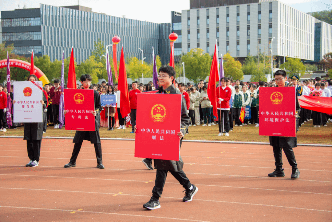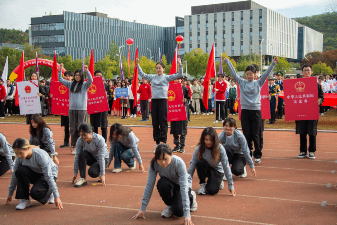 在舞蹈的高潮部分,一群身着法官服的同学缓缓步入场地中央,他们手持九张展板,每张展板上都绘有法律元素,都是法学知识的缩影。随着音乐的推进,这些同学巧妙地将展板拼凑在一起,最终形成了一个巨大的“法”字,象征着法律的庄严与权威,展现新时代中国法治建设新成就。