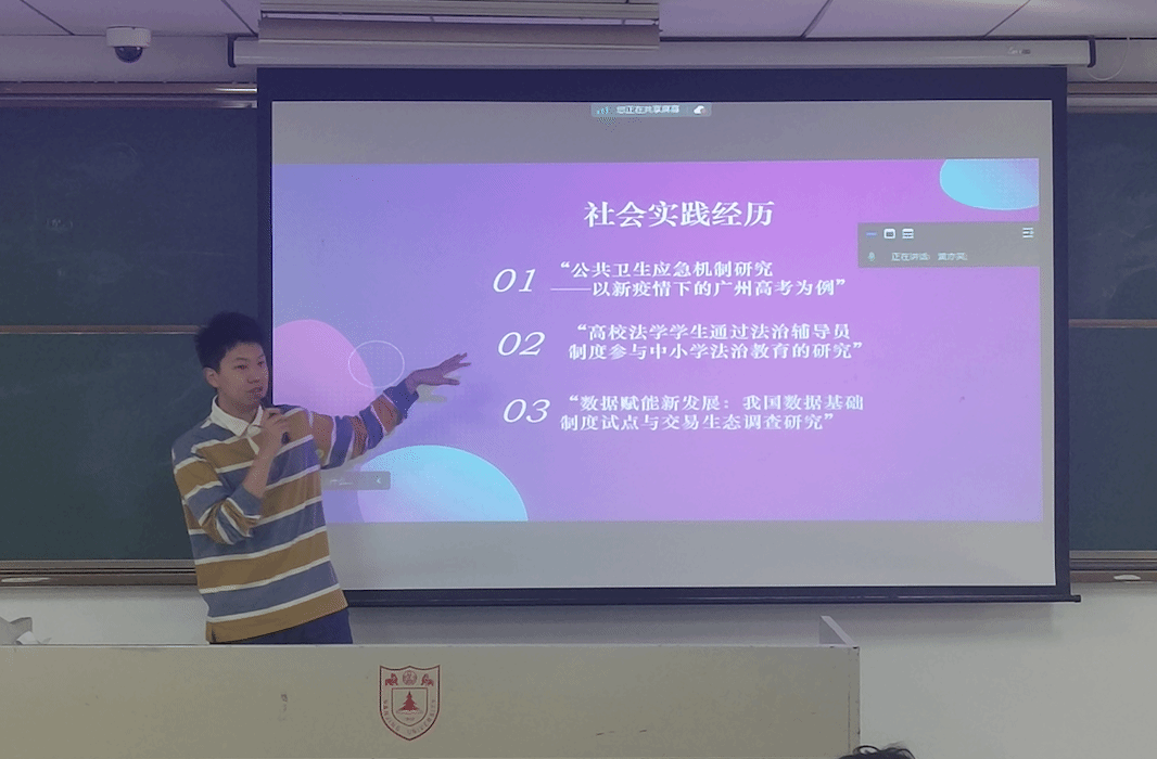 2023年11月18日上午9时至11时,南京大学法学院团委社会实践部举办的“循法而行,挺膺担当”法学院社会实践分享会在仙林校区仙2-304举行。本次活动由南大法学院团委和知行社联合举办,法学院2020级本科生胡志成学长和政府管理学院2020级本科生柳体洲学长作为主讲嘉宾出席,结合实践经历进行了经验分享和方法指导。分享会由22级团支部书记唐知圣主持。让我们一起回顾一下吧!