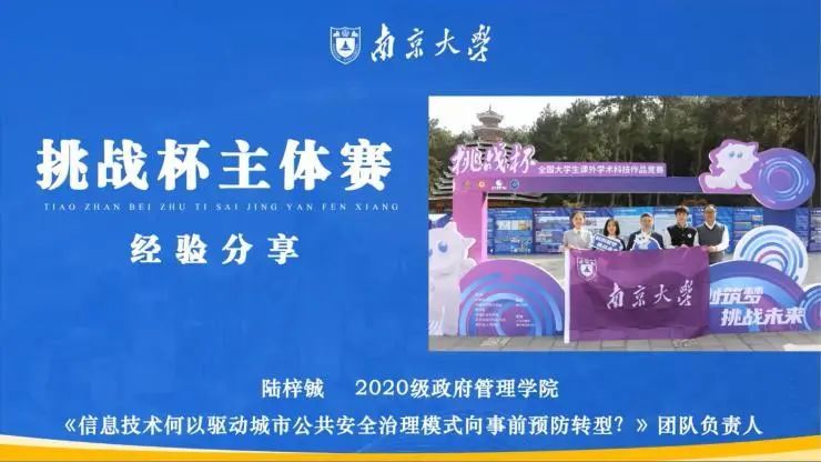 政府管理学院2020级本科生陆梓铖同学介绍了自己参加第18届“挑战杯”主体赛道的参赛经验。首先,介绍了“信息技术何以驱动城市公共安全治理模式”的研究背景、团队特色。其中,陆梓铖同学着重强调了多院系、跨学科团队的重要性,并在团队分工方面具体展现了不同学科间分工对项目推进的重大作用。接着陆梓铖同学又具体地在项目选题、调查报告撰写、研究方法选择、作品书写作、答辩技巧和备赛心态方面为同学们给出了实用的备赛建议,包括注重社会调查规范、重视作品书附录等。最后,陆梓铖同学非常有针对性地帮助法学院同学分析了近几年法律学科的“挑战杯”获奖作品,并建议同学们从中总结经验。