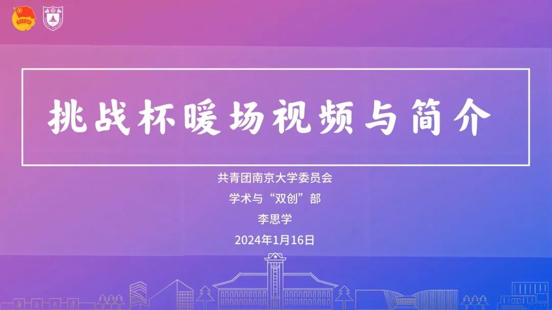 活动伊始,暖场短片《第十八届“挑战杯”南京大学风采展示》初步介绍了挑战杯的基本信息与南大故事。此后,校团委学创部李思学同学宣传了“挑战杯”全国大学生课外学术科技作品竞赛(简称“大挑”)和“挑战杯”全国大学生创业大赛(“小挑”)赛事的基本章程、赛道分组、激励措施,帮助同学们了解“挑战杯”是什么;并分享了从往届参赛经验中总结出的一般规律,动员同学们积极参加预报名中的第13届“小挑”和即将由南京大学主办的第19届“大挑”两类赛事。