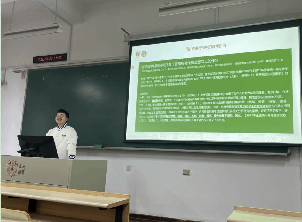 数字公式与推理,知识产权不可少。为了进一步增强数学系同学对于知识产权保护的理解与重视,3月24日上午,南京大学法学院团委志愿服务部走进南京大学数学系,开展了“法言智汇”之“知识产权进院系(数学系篇)”的活动。在本次活动中,2023级刑法研究生陈金森同学围绕“数学中的知识产权”这一数学系同学感兴趣的法律问题,进行了细致生动的普法宣讲。