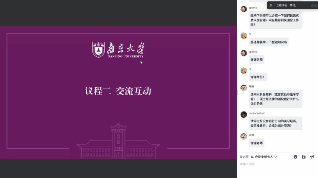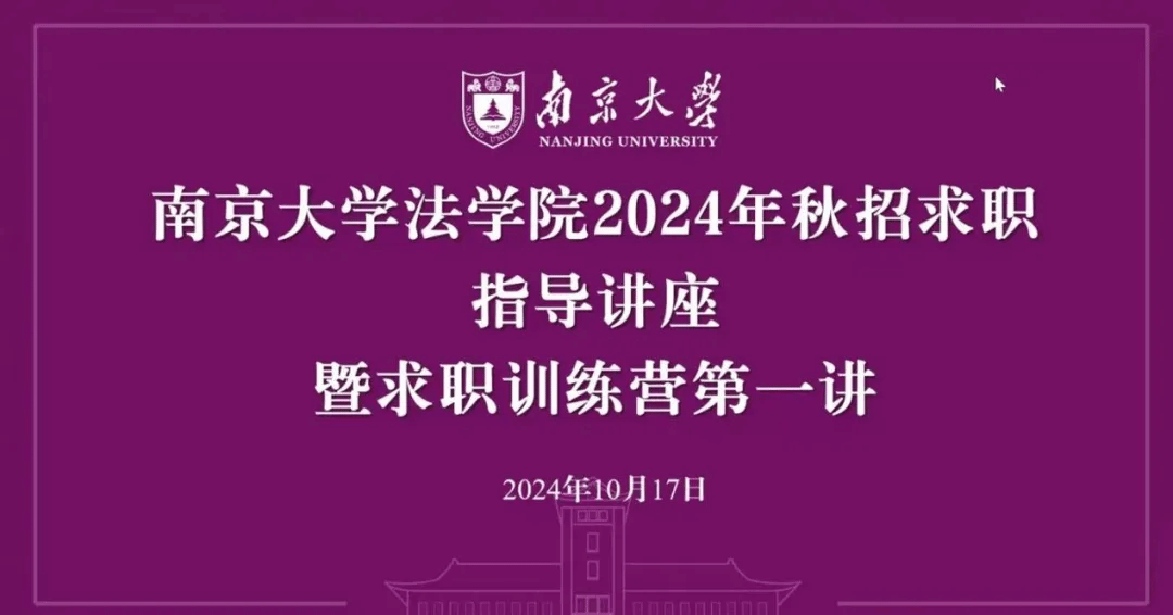2024年10月17日晚,南京大学法学院2024年秋招求职指导讲座暨求职训练营第一次活动于线上顺利举办。本次秋招求职指导讲座有幸邀请到法学院党委副书记马骏老师和北京银行股份有限公司南京分行人力资源部经理助理常悦女士作为嘉宾,他们分别从职业选择、简历制作、面试技巧等方面进行了讲解和答疑,从而帮助大家更好地了解企业需求和市场动态。本次秋招求职指导讲座不仅为奋战在求职之路的同学提供了专业的就业经验与策略,同时也增强了同学们的求职信心,提升了同学们的职业规划能力,助力同学们在激烈的就业竞争中脱颖而出。