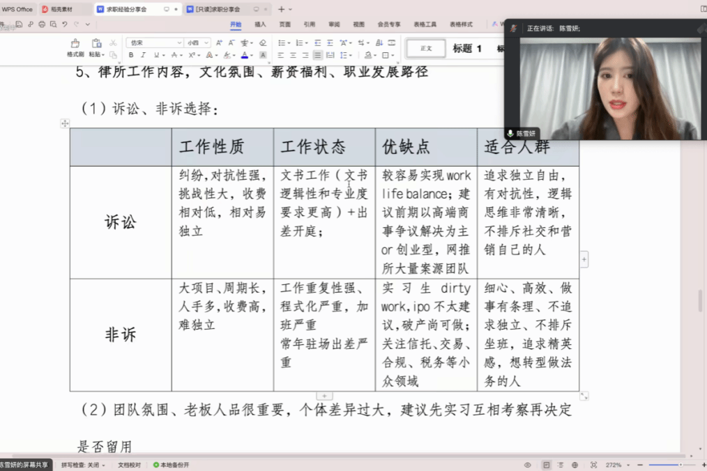 陈雪妍学姐首先从个人基本情况及选择律师行业的原因出发,分享了自己校招选择江苏移动人力资源部门、此后又转回律师行业的择业心路历程。随后,学姐以周洛华老师的《时间游戏》为引,以“人上人游戏”和“天外天游戏”比喻两种不同职业选择方向,建议同学们在职业选择时充分了解自己的性格和优劣势,结合自身家庭情况,并咨询行业前辈,充分了解、评估风险后再作决策。