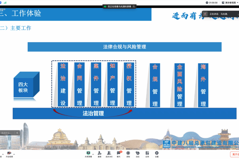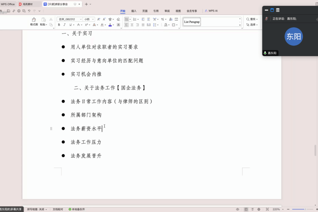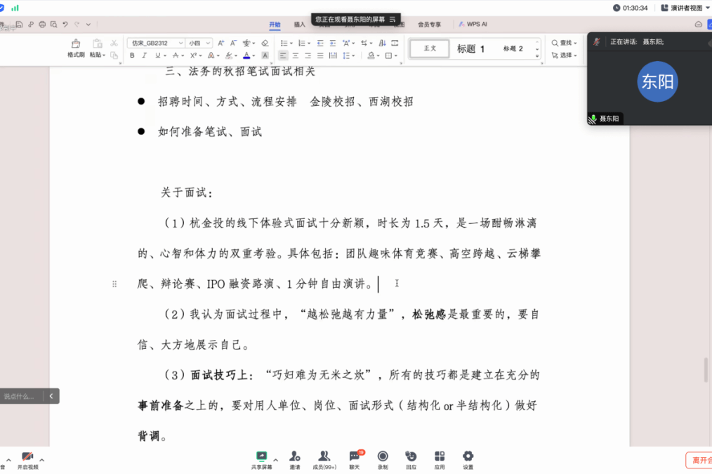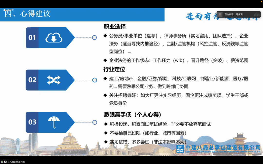 聂东阳学长首先和大家分享了自己的在校经历,随后详细讲述了个人的秋招选岗思路和秋招面试流程。他提到,以国企法务作为职业方向的优势在于:第一,可以实现工作生活平衡;第二,薪酬福利较有竞争力;第三,可以积累相关的行业经验,且在完成经验和资源积累后,倘若考虑从法务岗转向律师工作,此时阵痛期较短,而且在甲方服务的工作经验和看待问题的视角,也将对职业转型有所助益。
