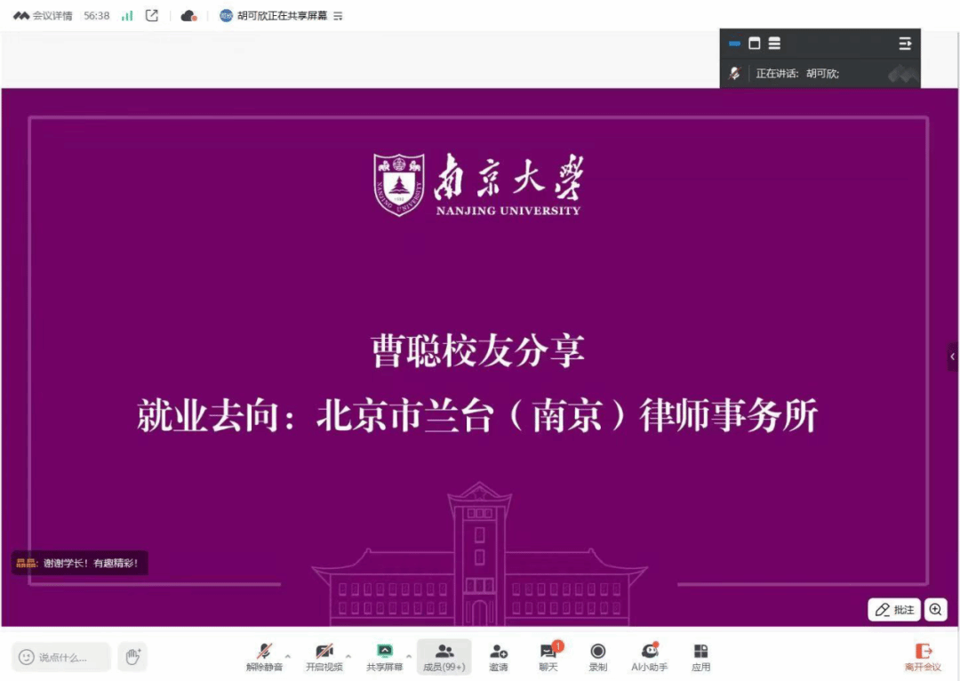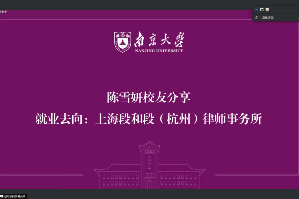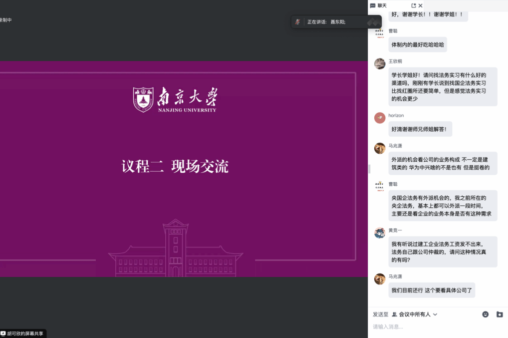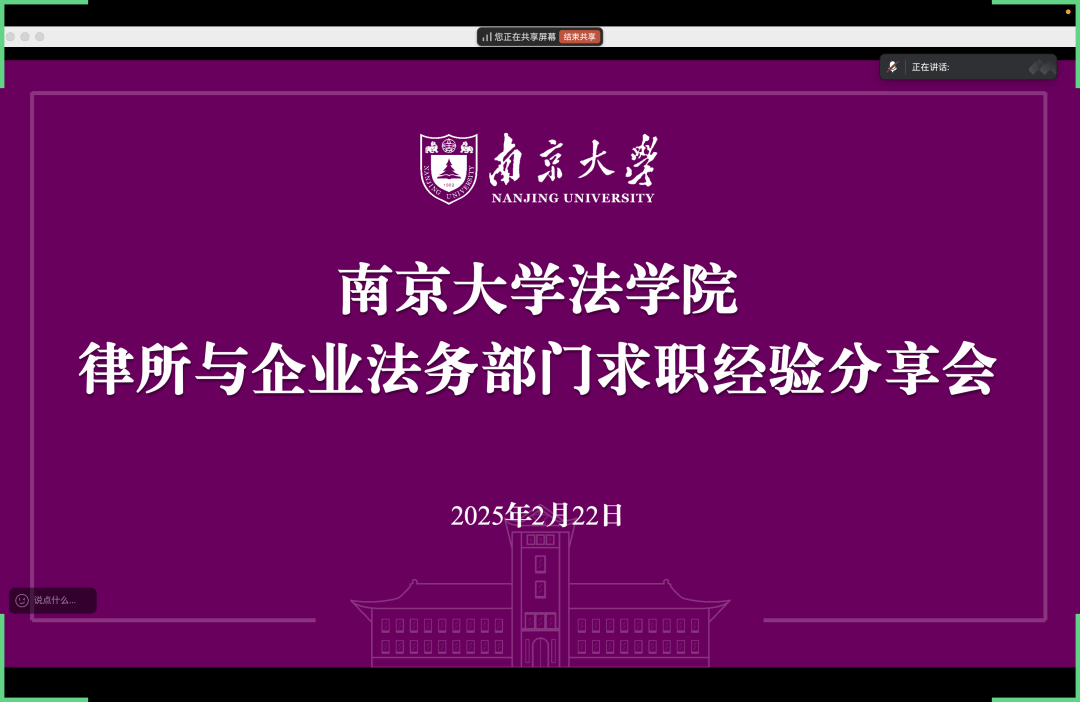 2025年2月22日晚19点,南京大学法学院“启明星”计划——律所与企业法务部门求职经验分享会顺利举办。本次活动有幸邀请到陈雪妍、曹聪、聂东阳、马兆潇四位就职于律所和企业法务部门的校友进行经验分享,旨在帮助法学院同学们更好地了解法律行业求职动态,掌握实用求职技巧,合理规划职业发展路径。