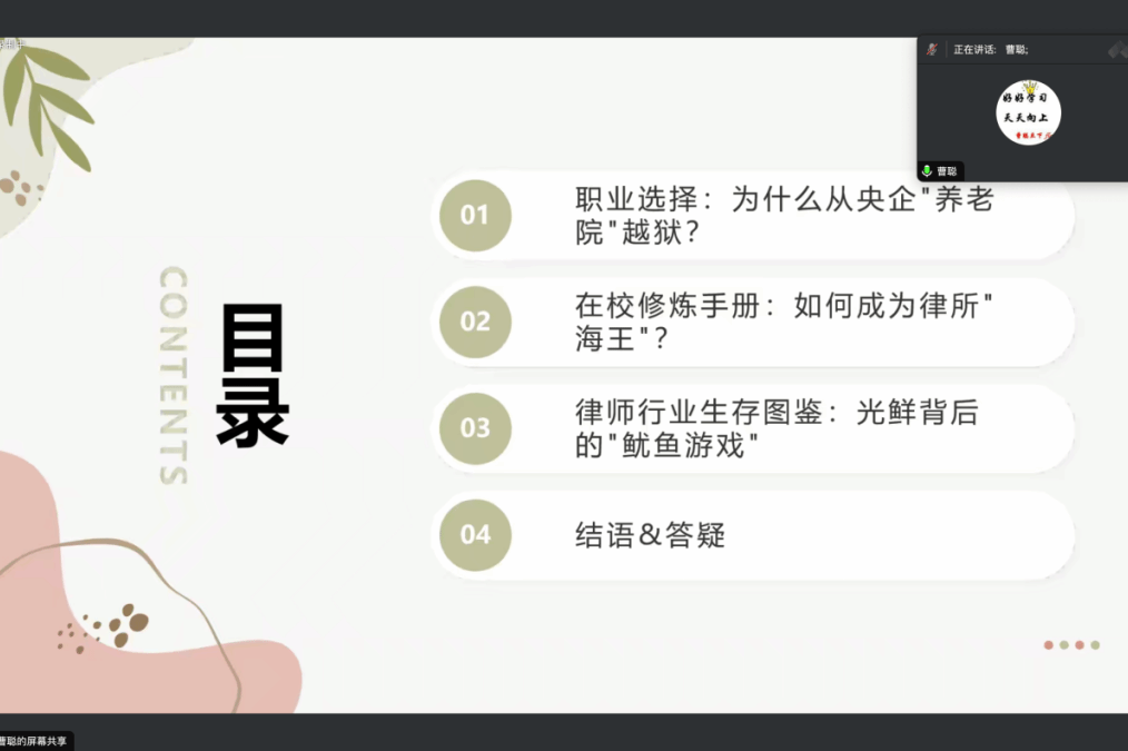 曹聪学长的分享从“职业选择”“在校修炼手册”“律师行业生存图鉴”三个方面展开。他首先从律所和法务工作的不同特点出发,分享了自己从央企法务向律师工作转向的原因。随后基于自身经验为在校同学提出了建议:读研期间可以以实习和成绩两方面作为抓手,一方面要通过关注学院实习群、联系校友等方式多主动争取实习机会,以提升自己的专业素养;另一方面也要注重课程学习,尤其是认真对待同今后执业方向可能相关的专业课程。