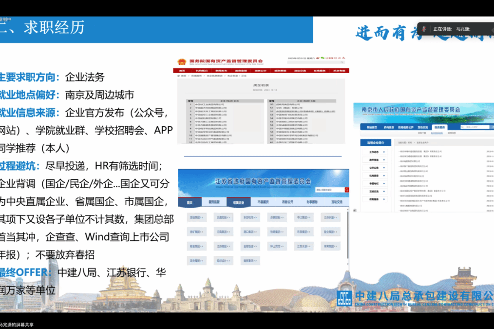 在分享求职经验时,学长提醒各位有意向从事法务工作的同学们,对企业而言,线下招聘会的简历在简历池的优先级较高。在求职过程中可以通过各级国资委官网查询国企的层级,也可以通过企查查、Wind等应用程序查询企业经营状况、上市公司年报等,在充分做好企业背调之后再决策。据学长介绍,目前其所在的法务岗位主要工作包括法治管理、合规管理、全面风险管理和海外管理四大板块,且国企法务的首要工作可能并非诉讼案件的处理,风险管理、企业合规往往更加受到重视,但是也并不缺乏强专业性法律问题的锻炼机会。最后,学长建议大家在求职过程中,积极投递积累面试笔试经验,抓住每一次和各企业、各同期求职同学交流、锻炼的机会,非必要不放弃,不要给自己设限、多多尝试。
