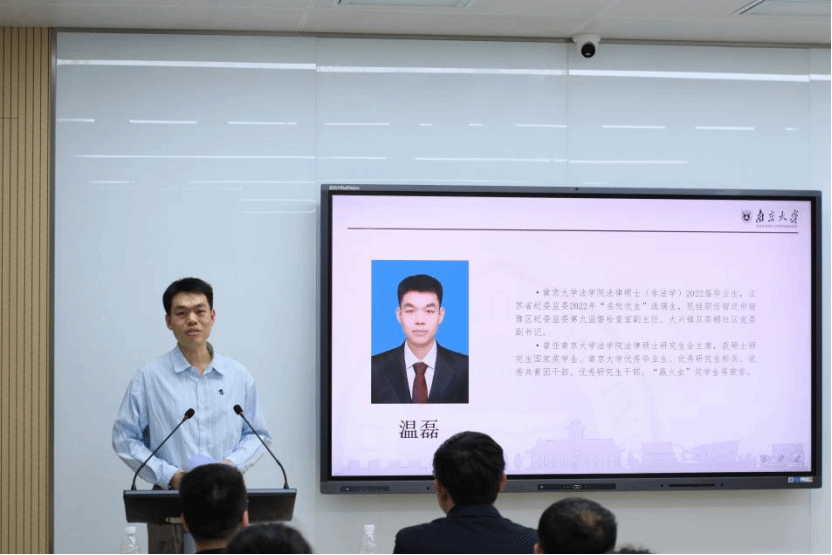 南京大学法学院法律硕士(非法学)2022届毕业生,江苏省纪委监委2022年“名校优生”选调生,现挂职任宿迁市宿豫区纪委监委第九监督检查室副主任、大兴镇双茶棚社区党委副书记的温磊师兄分享了自己作为一名选调生,从学校到机关、从机关到基层的工作经历。通过分享自己在基层工作中的点滴,温磊师兄强调作为一名选调生,需要深入基层,展开调查研究,了解民情民意,解决群众急难愁盼的问题,让群众满意是自己在工作中最大的成就感来源。