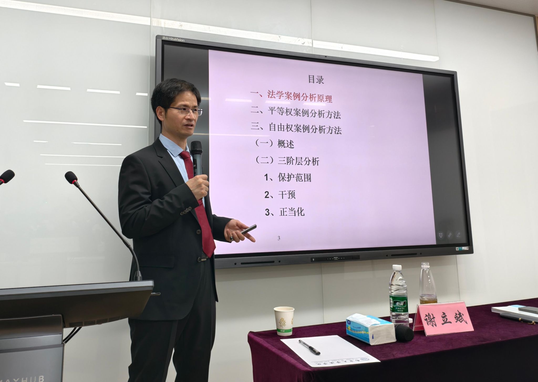谢立斌从法律规范的概念引入,解释了案例分析原理的核心逻辑,说明何谓“鉴定式”案例分析,并对比民法、刑法说明宪法案例分析致力于审查国家机构、基本权利等宪法规范是否被违反的问题。就基本权利而言,一般平等权规范指如果区分对待在宪法上无法得到正当化,则侵犯一般平等权;关于“区分对待”,谢立斌通过框架分析是否侵犯平等权,并介绍了美国宽松审查与严格审查的经验。谢立斌还分析了性别平等权审查框架。就自由权分析框架而言,分为针对具体行为和立法的审查,谢立斌从保护范围、干预、正当化三个角度分别分析。在此基础上,谢立斌说明了比例原则的审查框架,并重点分析了干预的正当化。
