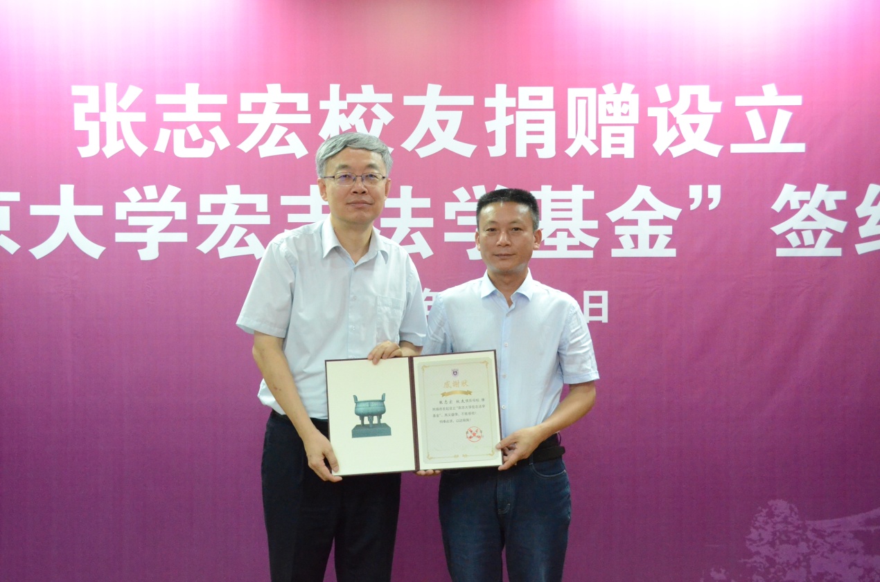 张志宏先生系我校1992届法学院毕业生,毕业后曾在法院等司法部门工作,后创业从事房地产开发。2017年,张志宏校友曾捐建南京大学鼓楼校区南园小楼;2018年,张志宏校友捐资300万元设立南京大学“宏志全球法律英才计划”,激励法学院学子赴全球顶级法学院留学深造。本次“宏志法学基金”的设立是张志宏校友在半个月内的第二次慷慨捐赠。