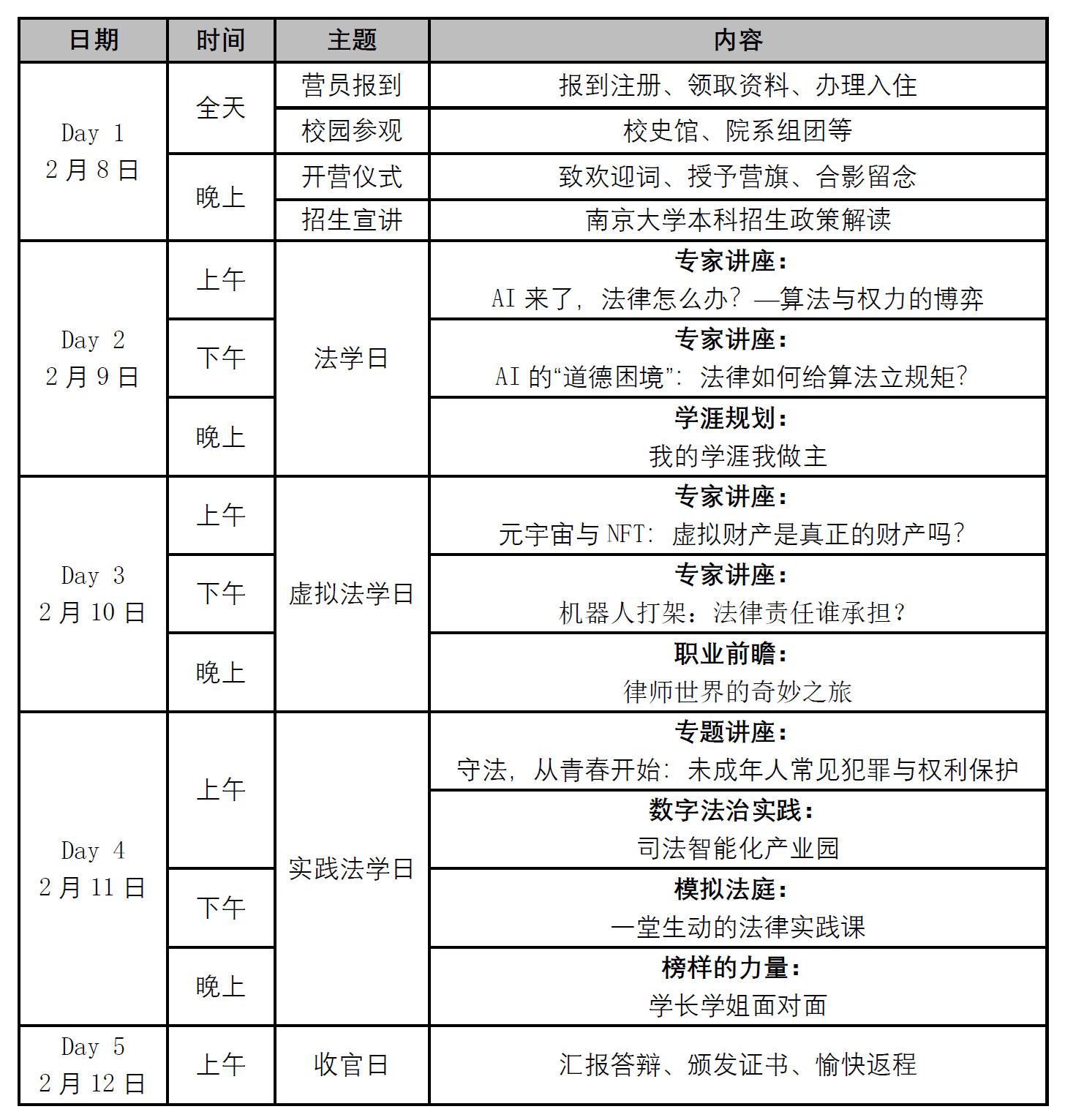 备注:课程内容、授课师资及时间安排将根据实际情况微调,确保教学质量与体验。专题营课堂教学全程在南京大学校内开展,外出实践教学统一安排。