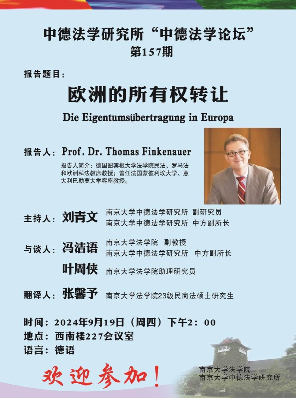 中德法学研究所邀请,来自德国图宾根大学的Thomas Finkenauer教授为第157期“中德法学论坛”做了题为“欧洲的所有权转让”的学术讲座。