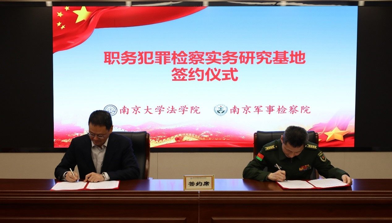 3月31日,南京大学法学院与南京军事检察院签署共建合作协议,设立职务犯罪检察实务研究基地。法学院院长彭岳与南京军事检察院大校检察长刘剑签订共建协议,法学院党委书记蒋恩铭与刘剑检察长共同为检察实务研究基地揭牌。