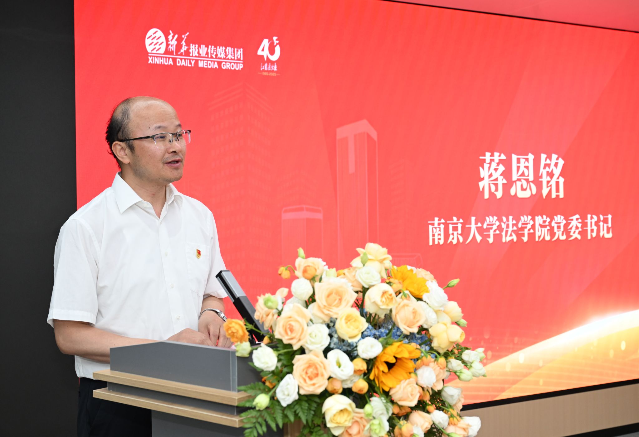 蒋恩铭在发言中表示,南京大学法学院是国家首批卓越法律人才培养基地、国家级一流本科专业建设点。南京大学法学学科始终处于中国大学的第一方阵,获得了公认的社会影响和学术声誉。近年来,法学院高度重视党建工作、教学科研及学生培养,面对新的形势要求,法学院系与法治媒体加强协同联动,是打破校园与社会边界、贯通课内课外、完善以实践为导向的法律人才培养机制的有益尝试。他介绍了法学院近期建设成果,特别是2024年法学院入选全国党建标杆院系,专门成立了以本硕博优秀学生为主体、面向校内的习近平法治思想宣传队伍,切实做习近平法治思想的坚定信仰者,积极宣传者,模范践行者。