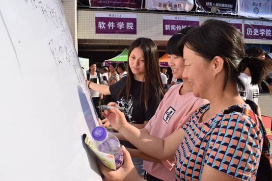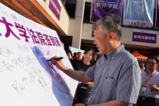 随后,南京大学张异宾书记专程来到迎新现场指导与慰问,表扬和肯定了法学院迎新工作中学长信笺、留言板等的准备和设计,并在法学院签到簿留下签名,与志愿者们交流、合影。