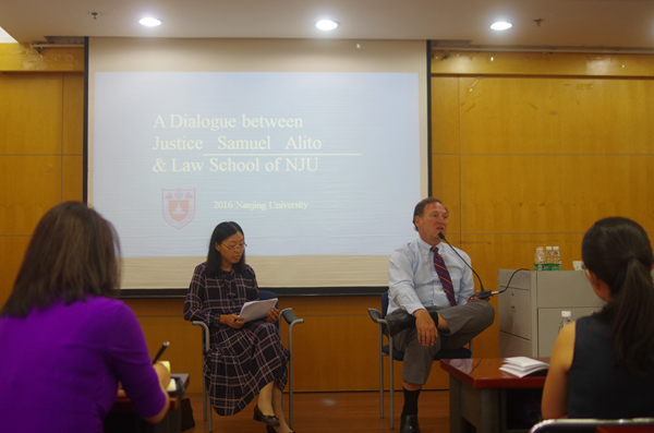 2016年9月13日上午,南京大学法学院与美国联邦大法官Samuel Alito的精彩对话在逸夫管理科学楼1101学术厅成功举行。本次对话由法学院院长叶金强教授致欢迎辞,焦燕副教授担任主持人。副院长宋晓、严仁群、李友根、宋亚辉、吴英姿、张慰、张复友、徐凌波等学院教授副教授和法学院各专业同学参加了此次活动。