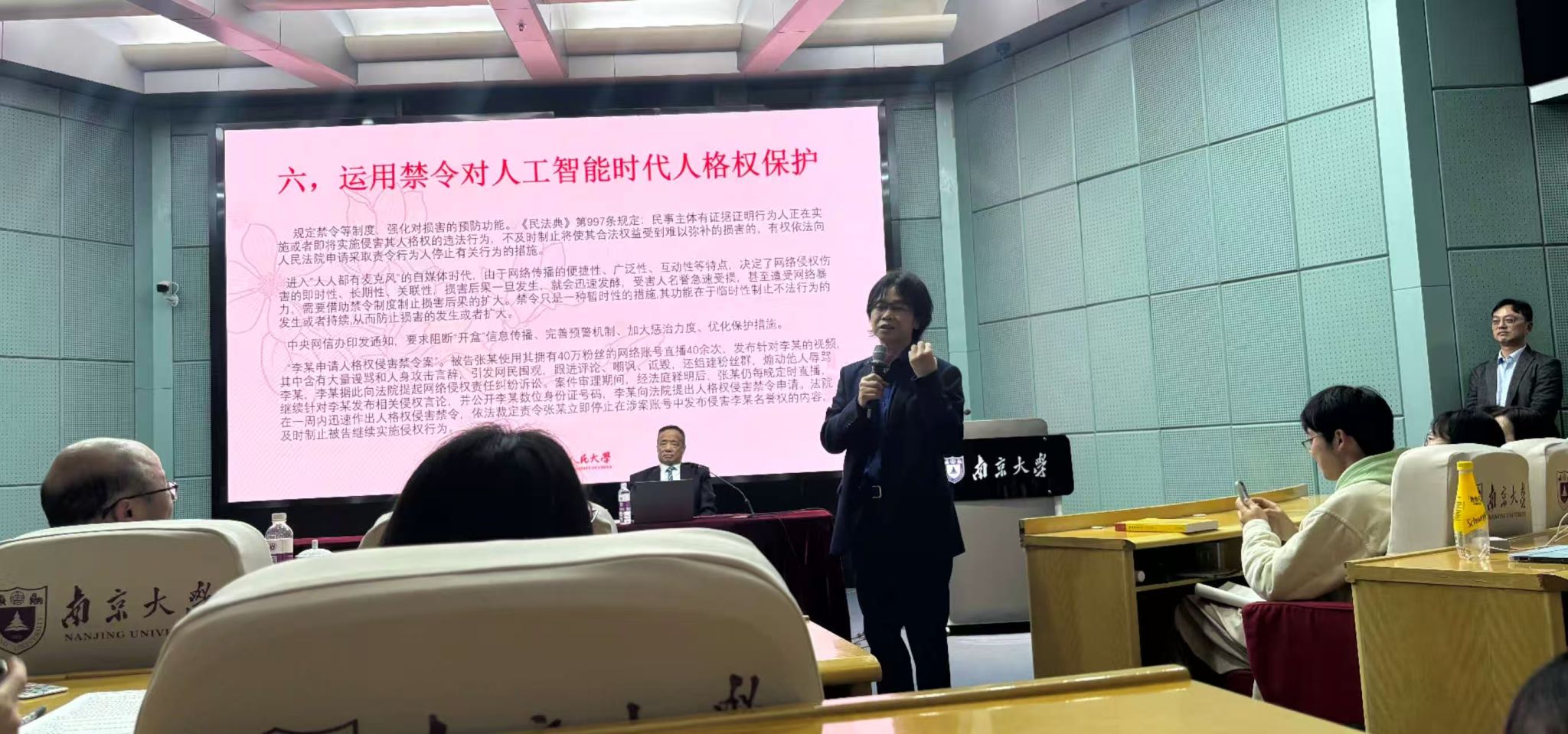 2025年11月7日晚,南京大学法学院名家论坛讲座之一百六十期在鼓楼校区科技馆二楼报告厅举行。应南京大学法学院邀请,中国人民大学一级教授、博士生导师、中国法学会副会长、中国法学会民法学研究会会长王利明教授为南大师生作了题为“生成式人工智能侵权风险与应对”的讲座。本次讲座由南京大学法学院副院长刘勇教授担任主持人,南京大学法学院党委书记蒋恩铭、叶金强教授、王建文教授、朱庆育教授、潘重阳副教授等参加了本次讲座。