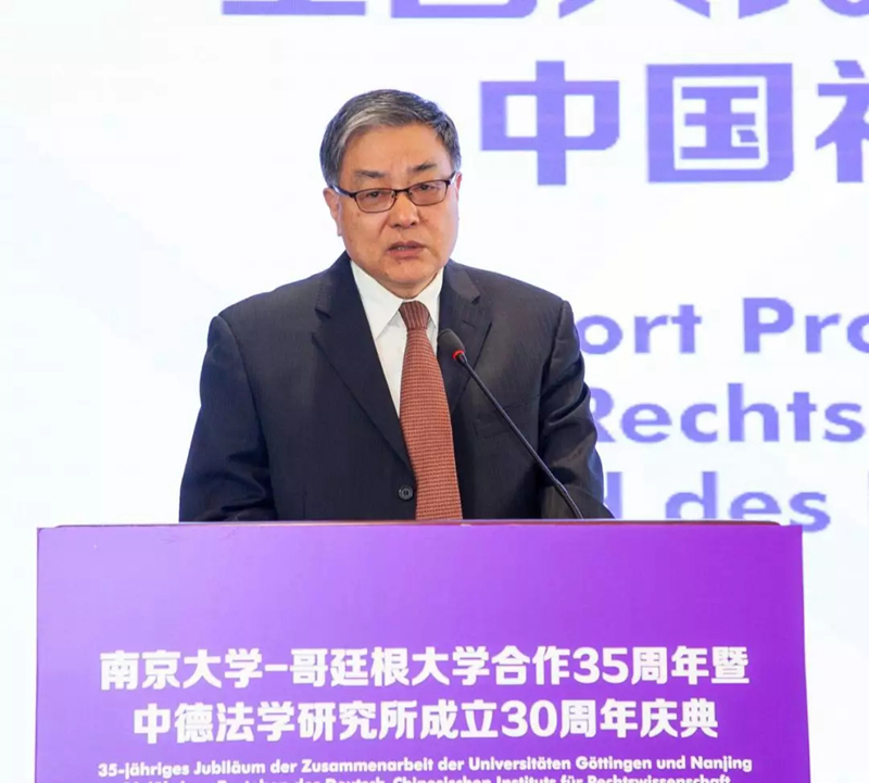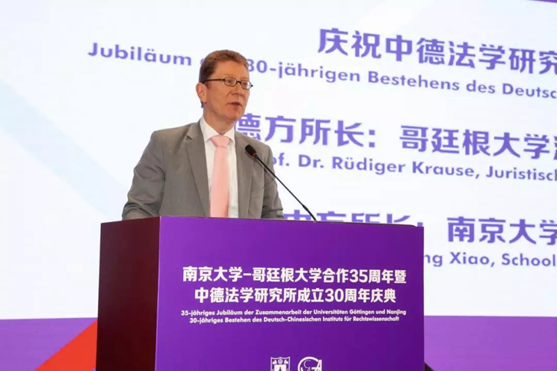 德方所长、哥廷根大学教授迪格·克劳泽回顾了35年来两校的合作交流。克劳泽指出,这次庆典是回顾发展历程、展望未来发展、寻找新的发展机遇的良好契机。南京大学与哥廷根大学的两校合作可以追溯到1985年,在1989年两校决定将这种合作机构化,将中德法学研究所投入运作。最早中德经济法研究所的研究领域为经济法,在2001年扩大到民法及公法,并正式更名为中德法学研究所。在2008年,哥廷根大学成立了中德法学研究所的伙伴所,并由迪格·克劳泽和皮特·托比亚斯·斯托尔担任所长。在两校多个机关的大力支持下,中德法学研究所在多方面实现了突破性发展。在人才培养方面,从最初每年的招收6个学生,到2010年提升到12名学生,人才培养规模在不断扩大,中德法学研究所学子在中德政府机关、法院等机构中成为中坚力量,是德国法在中国的传播者,同时也是中国法在德国的转播者。此外,2012年在德国成立的中国法硕士项目招生规模也在不断扩大;在学术研讨方面,过去10年中德双方合作举办了多次学术会议,促进了两国学者的学术交流。同时,《中德法学论坛》和《中国法杂志》的定期出版也为两国学术交流提供了重要平台。将来,两校会进一步提高培养层次、扩大培养规模、强化科研合作,为日益复杂的中国法律发展环境建言献策。此外,克劳泽院长期待能够进一步加深两国人民的了解,共建两国互信互利关系的前提。