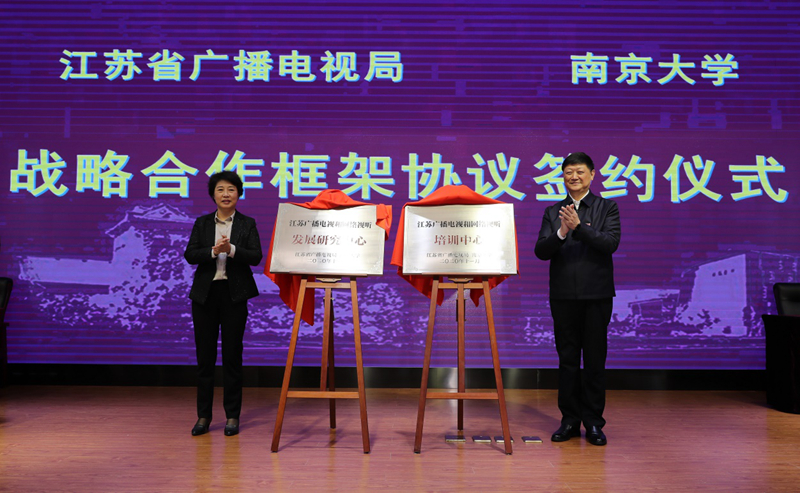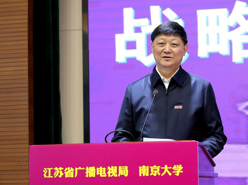 11月23日上午,江苏省广播电视局与南京大学战略合作框架协议签约仪式在我校鼓楼校区举行。双方将在人才交流培养、高端智库打造、精品创作生产、媒体融合发展、基地(园区)建设等方面全方位深化交流合作,加快推动江苏广播电视和网络视听行业高质量创新性发展。校党委书记胡金波,江苏省广播电视局党组书记、局长缪志红出席仪式并致辞。校党委常委、副校长邹亚军,校党委常委、党委办公室主任、组织部长、统战部长王明生,省广播电视局党组成员、副局长吴以桥,省广播电视局党组成员、副局长尹晓平参加仪式。仪式由省广播电视局党组成员、副局长于国民主持。