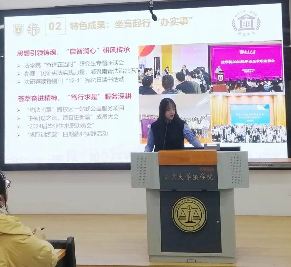 团委(学生)副书记依次介绍分管领域的工作情况。高嘉悦从项目培育、学术创新和基础服务三个角度出发对学创部工作成果进行展示;章岳珲着重介绍了社会实践部和生涯发展部持续以孵化“南法青年为科技强国保驾护航”的社会实践项目为工作导向,坚持探究法学学子在学习实践中如何以专业技能为科技创新保驾护航;赵奕淳聚焦思想引领、内部建设、重点主题三个方面,展现了志愿服务部在增强信念、完善制度、打造品牌三个方面获得的成果;朱滢从“坚守组织之门,常亮组织之灯”和“练就宣传之文,驻扎宣传之营”两大主题出发,分别对组织部和宣传部的工作成果进行汇报。