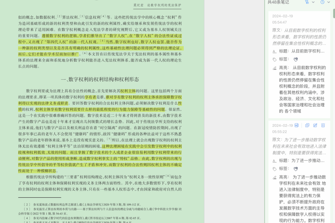 【法研心得】平时阅读法学文献或者法律相关书籍时,我习惯一遍用高亮在文中标出我认为重要的内容。有时候我以文字批注的方式在空白处对某一部分进行简要总结,或写出我的心得、提出我的疑惑。通过这样的方式,我可以在之后每次阅读的时候迅速熟悉文本、了解重点。阅读后,我会对知识点进行整理。对不同重要类型的知识点,我会以不同字体进行整理:譬如,标题加粗,重要知识点用宋体,补充性知识点用仿宋,这样可以让我在之后浏览整理的笔记时,迅速了解知识点的主干和框架。