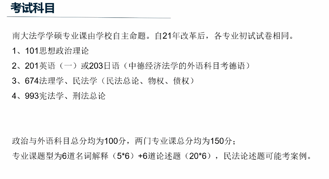 南大法学学硕专业课由学校自主命题,在2021年考试改革后,不同专业的初试考试科目相同。初试分为四科,思想政治理论、英语(一)或日语(中德经济法学的外语科目为德语)、专业课一(法理学、民法学)、专业课二(宪法学、刑法学)。其中专业课(一)的难度高于专业课(二),同时需要注意的是台湾av影片