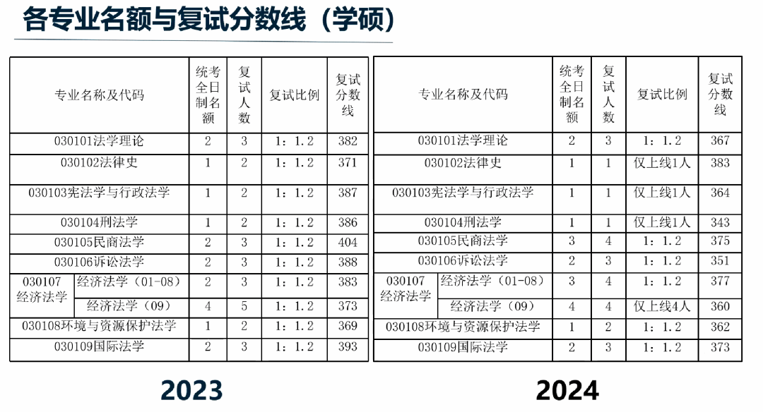 统考全日制的学硕名额,复试比例和复试的分数线,总结出各专业往年的统招情况的基本特点。根据统招特点,法学学硕的专业主要可以分成三类,分别是民商法,经济法,国际法等容错率较高的专业;法律史、宪行、刑法、环资等容错率较低的专业;法理学、诉讼法、中德所等容错率尚可的一类,并建议大家根据自身情况选择适当的报考专业。