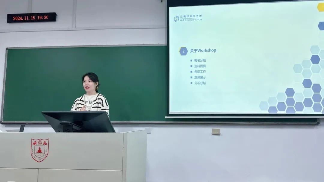 宣讲会一共分为三个部分。校友鲁帅杰律师、宿文嘉律师、合伙人马谦律师分别为大家带来了汇衡的基本介绍,本届Workshop的报名方式、评分规则和分组安排以及本次案例的解析。