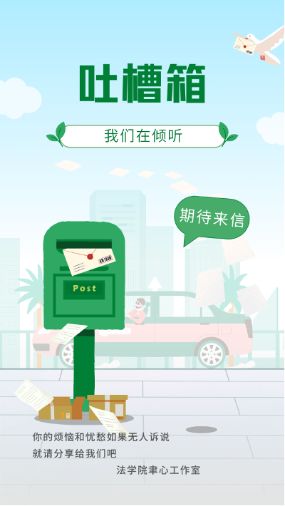 聿心工作室特别成立了“烦恼吐槽箱”——在浦口校区文科楼东大厅设立实体“吐槽箱”,同步以“NJU Law聿心”微信号为依托设立线上“吐槽箱”。